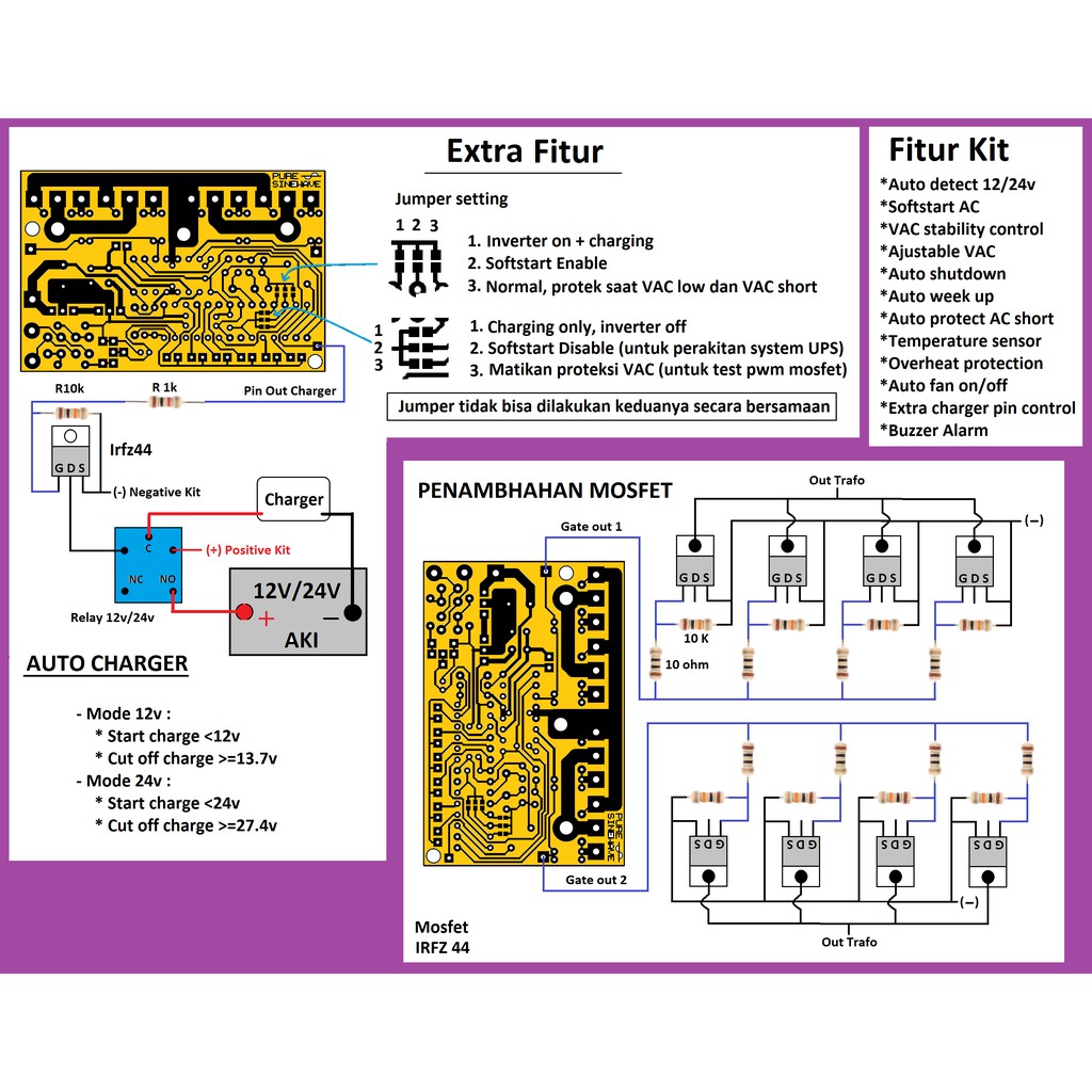 Listrik tenaga matahari untuk kepentingan rumah tangga maupun pertokoan dan industri. terutama untuk backup listrik saat PLN padam. hasil gelombangnya. .modul atau kit inverter murah Skema inverter gelombang sinus Rangkaian inverter gelombang kotak memerlukan komponen yang sangat sedikit. Konfigurasi full atau half bridge adalah skema switching yang.